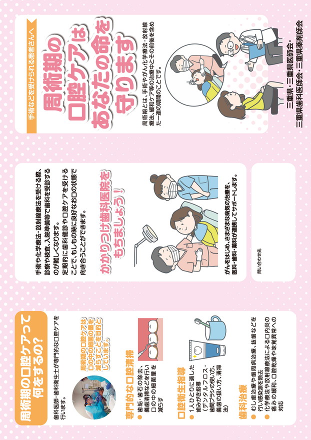 パンフレット 歯間ブラシデンタルフロスを使いましょう 妊婦歯科健診受診勧奨3つ折リーフレット 三重の8020生涯を通じたお口の健康づくり 食物を用いない基礎訓練 1歳6か月児・3歳児 歯科健診 早見マニュアル 母子健康手帳を活用しましょう 母と子の歯っぴいライフ 災害時のお口のケアに関するリーフレット 8020推進月間チラシ 成人用 喫煙と口腔の健康について 糖尿病治療を受けている患者さんへ【3つ折リーフレット】 周術期の口腔ケアはあなたの命を守ります【3つ折リーフレット】 骨粗しょう症の患者さまへ【3つ折リーフレット】 抗血栓薬を服用している患者さまへ【3つ折リーフレット】 冊子 歯科訪問診療マニュアル 口腔機能向上マニュアル フッ化物洗口マニュアル 知っておきたい歯科の健康知識 むし歯予防のためのフッ化物応用マニュアル(令和3年3月) 歯医者さんがすすめる食育 障がい者歯科健診保健指導マニュアル 地域口腔衛生活動の手引き 歯科医師の立場からの子ども虐待防止と子育て支援 説明動画(Youtube) その他 妊婦歯科健診受診勧奨ポスター 歯と口のつくりをたんけんしよう 歯と口のはたらきたんけんしよう 6歳臼歯保護育成カード 医歯薬連携で糖尿病治療をサポートします 周術期の口腔ケアはあなたの命を守ります 骨粗しょう症の患者さまへ【ポスター】 抗血栓薬を服用している患者さまへ【ポスター】